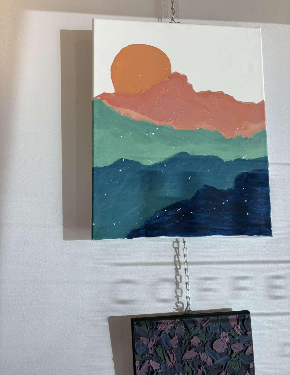 Pieces must be ready to hang with wire on back, able to attach to S-hooks onto chains.